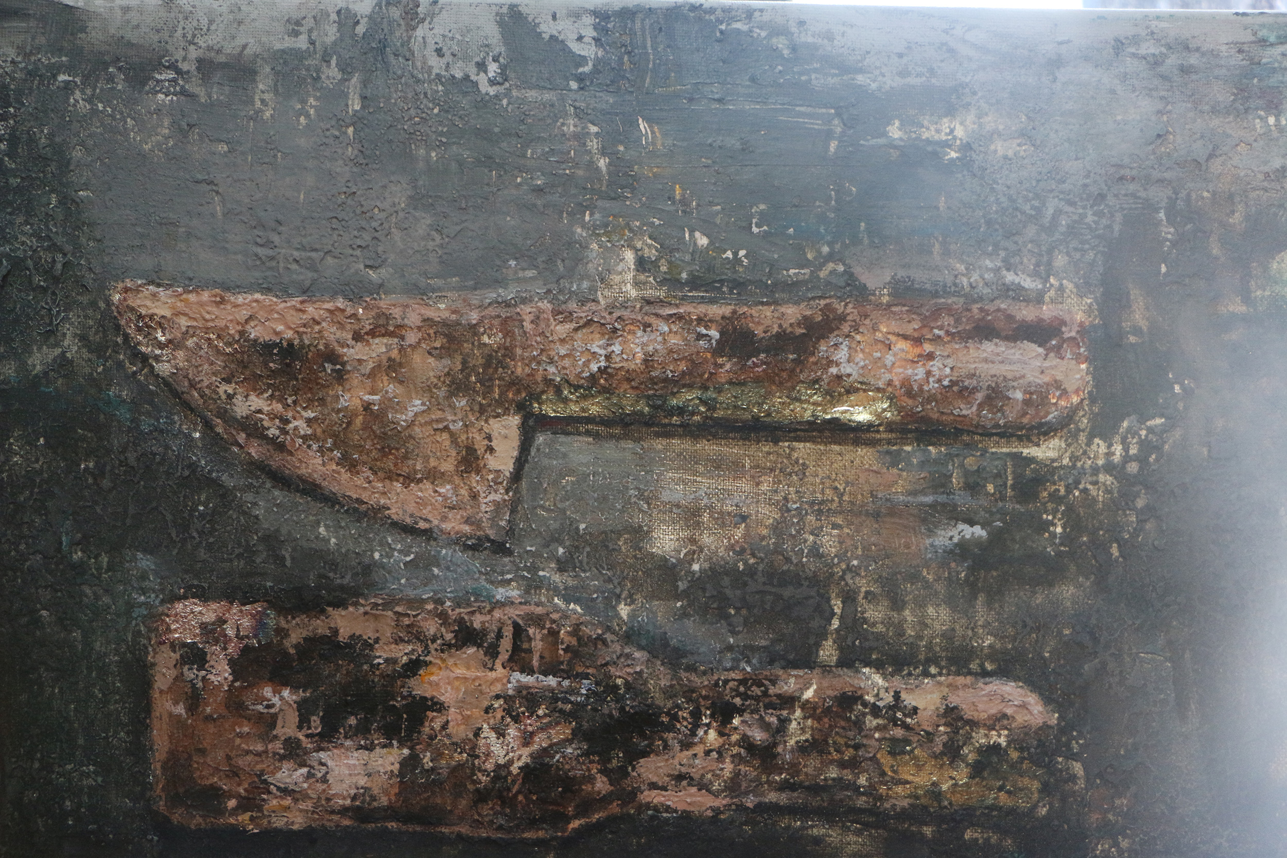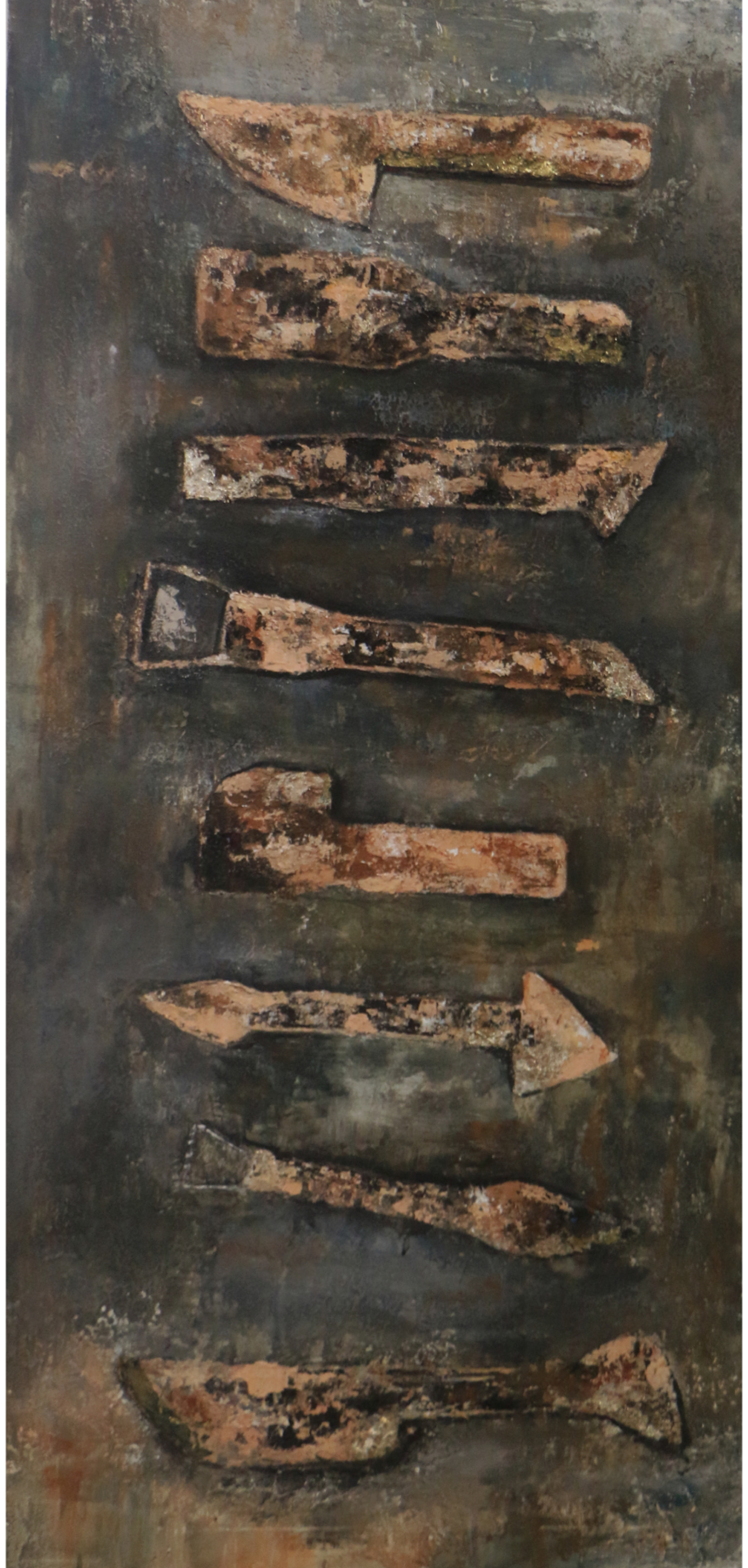 这八把泥塑刀是老师把刀带到教室给我们介绍工具的时候注意到的,当时只是觉得这些刀的形状都很不一样,心里便有了好奇心。当我拿起这些刀近距离看的时候,上面有铁锈和刀本来的黑色,以及红泥的颜色,这些组合刀这把刀上,就像被精心组织过的一样,那种使用过的痕迹,以及斑驳的感觉让我有了记录下来的冲动。平时只是把它们当工具使用而已,并没关注到雕塑刀原来也可以成为艺术表达的一部分。所以我就画了这八把雕塑刀,用相对写意的手法,体现雕塑刀也有像在做泥塑时的意气风发。