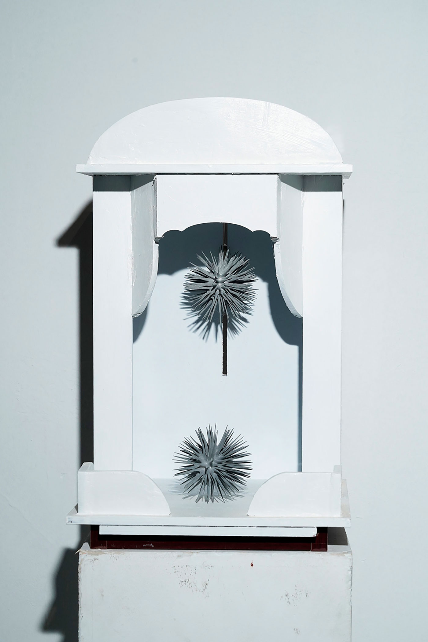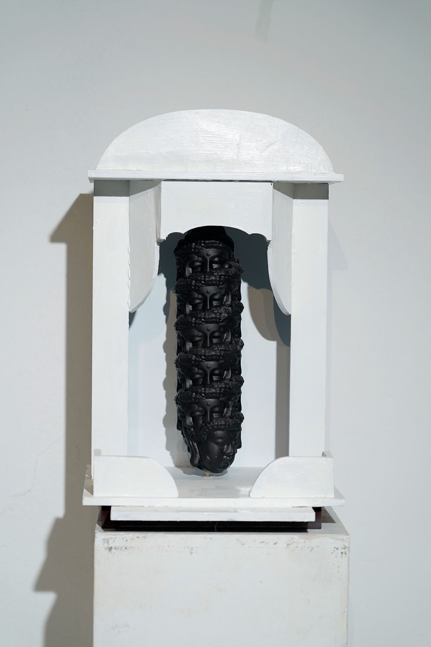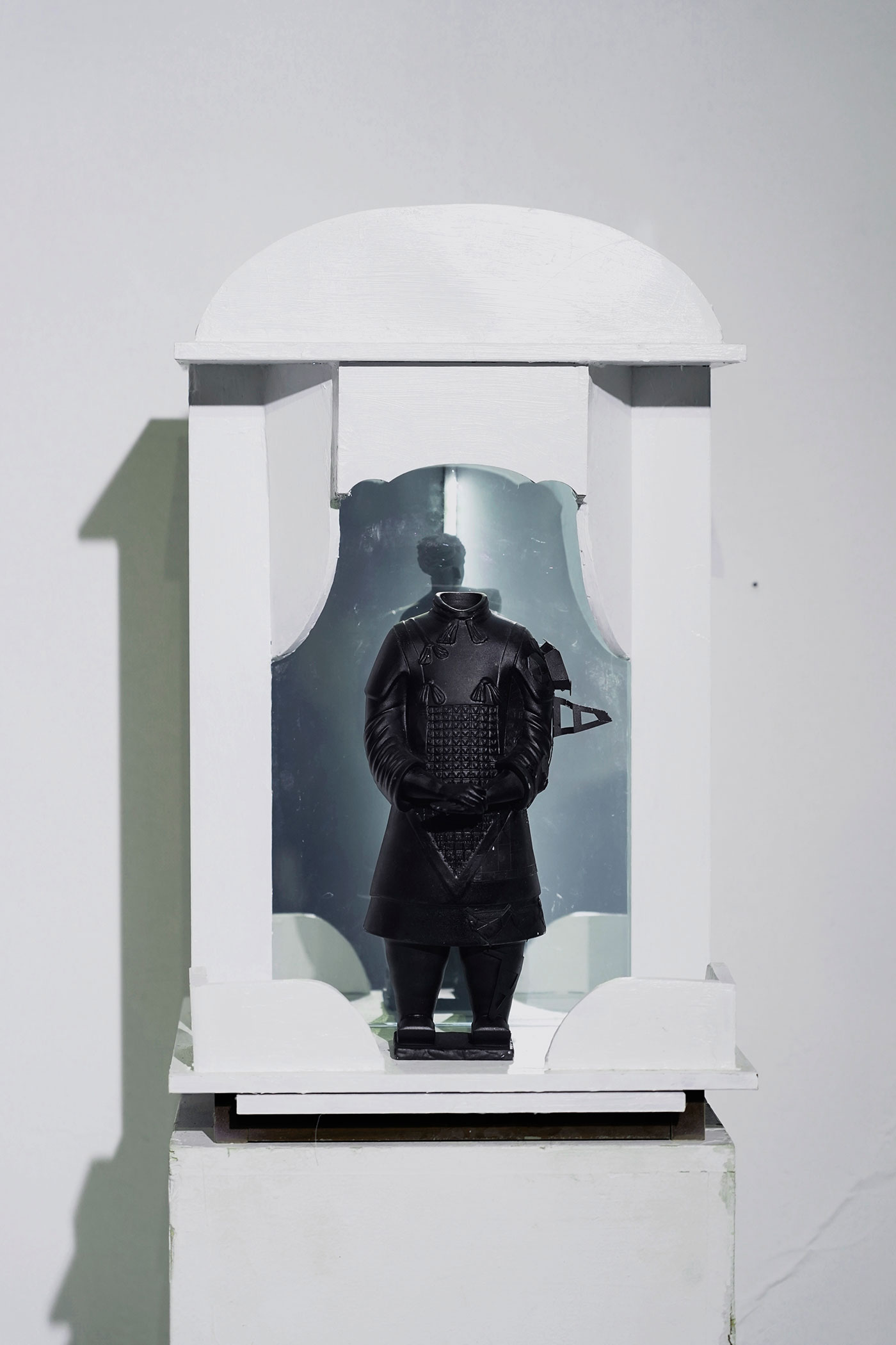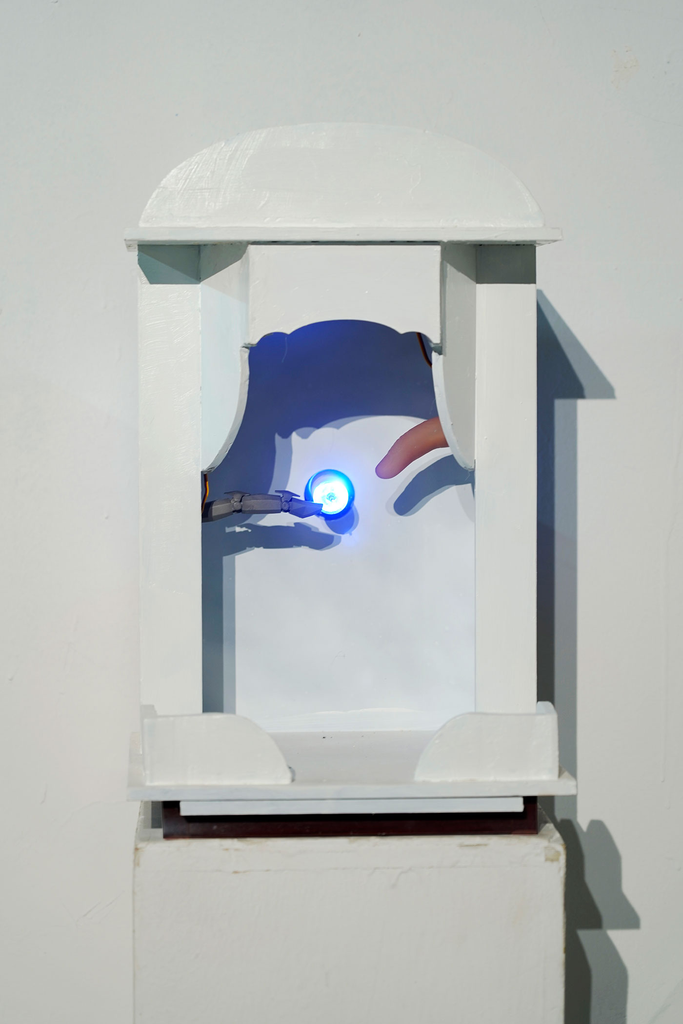 科学技术的飞速发展给我们带来了许多便捷,带给了我们无限的感官刺激,与普通人而言科学越来越神奇,我们的上网的痕迹被记录,行为被大数据分析,普通人在科技面前单向透明,在未来科技会不会异化成如宗教一般。人们一边享受着科技的带来的便利,一边也被科技所带来的强权压迫,甚至人工智能会不会真的获得智能,打破图灵三原则?我很乐观的看待科技的发展,但又不无悲观的揣测我们的未来。于是我想到利用神龛这一个符号来做一些东西。或许在未来的神龛里真的会摆上代表科技的偶像。