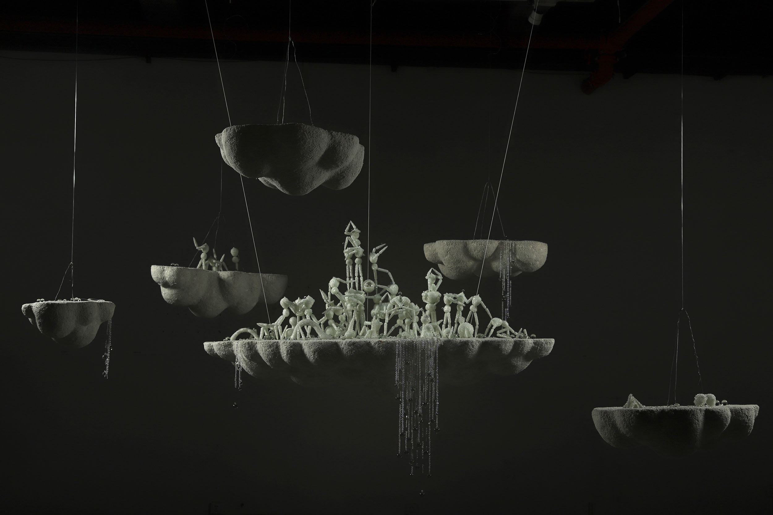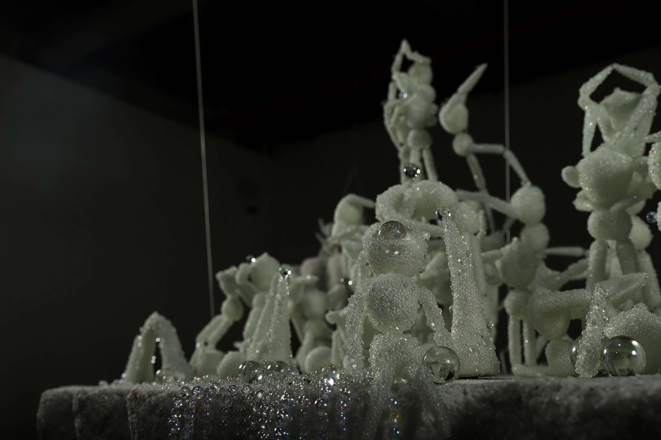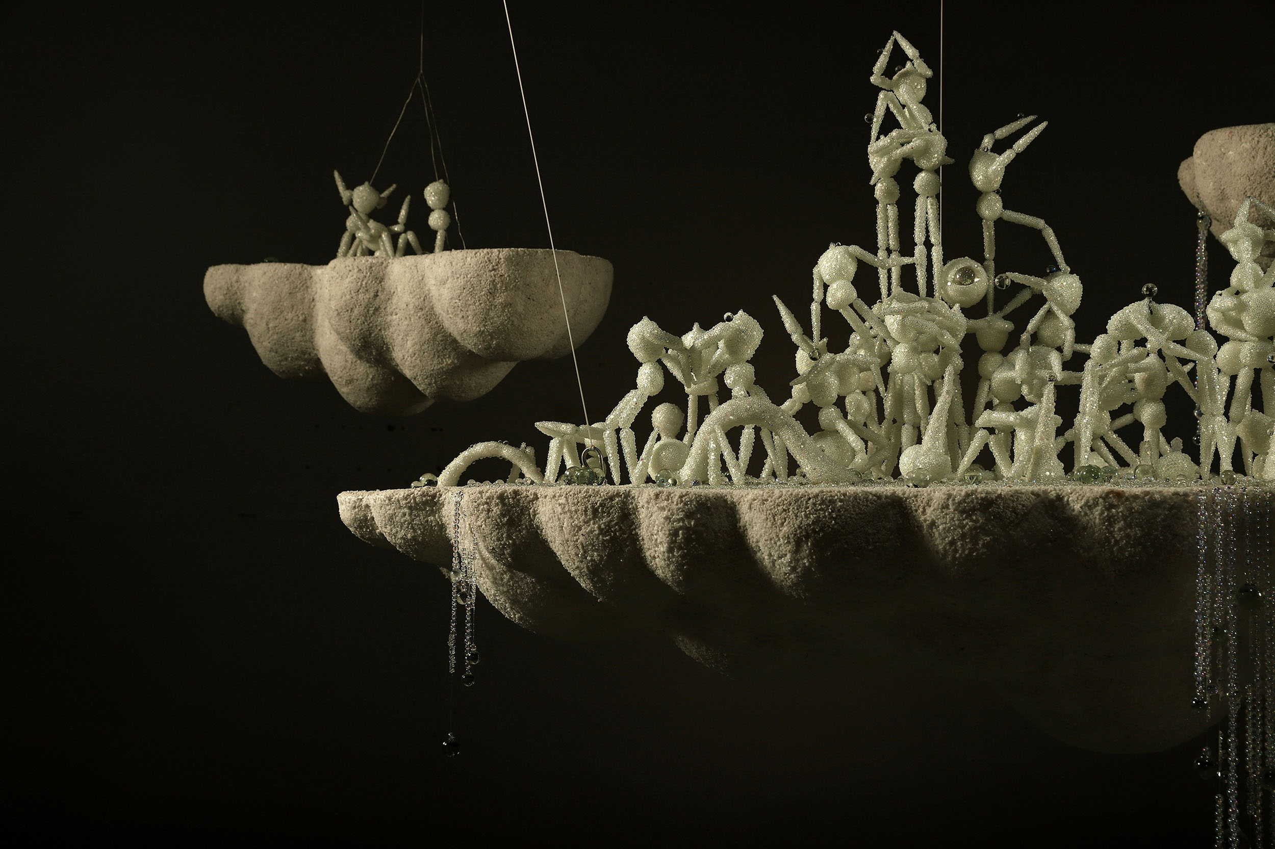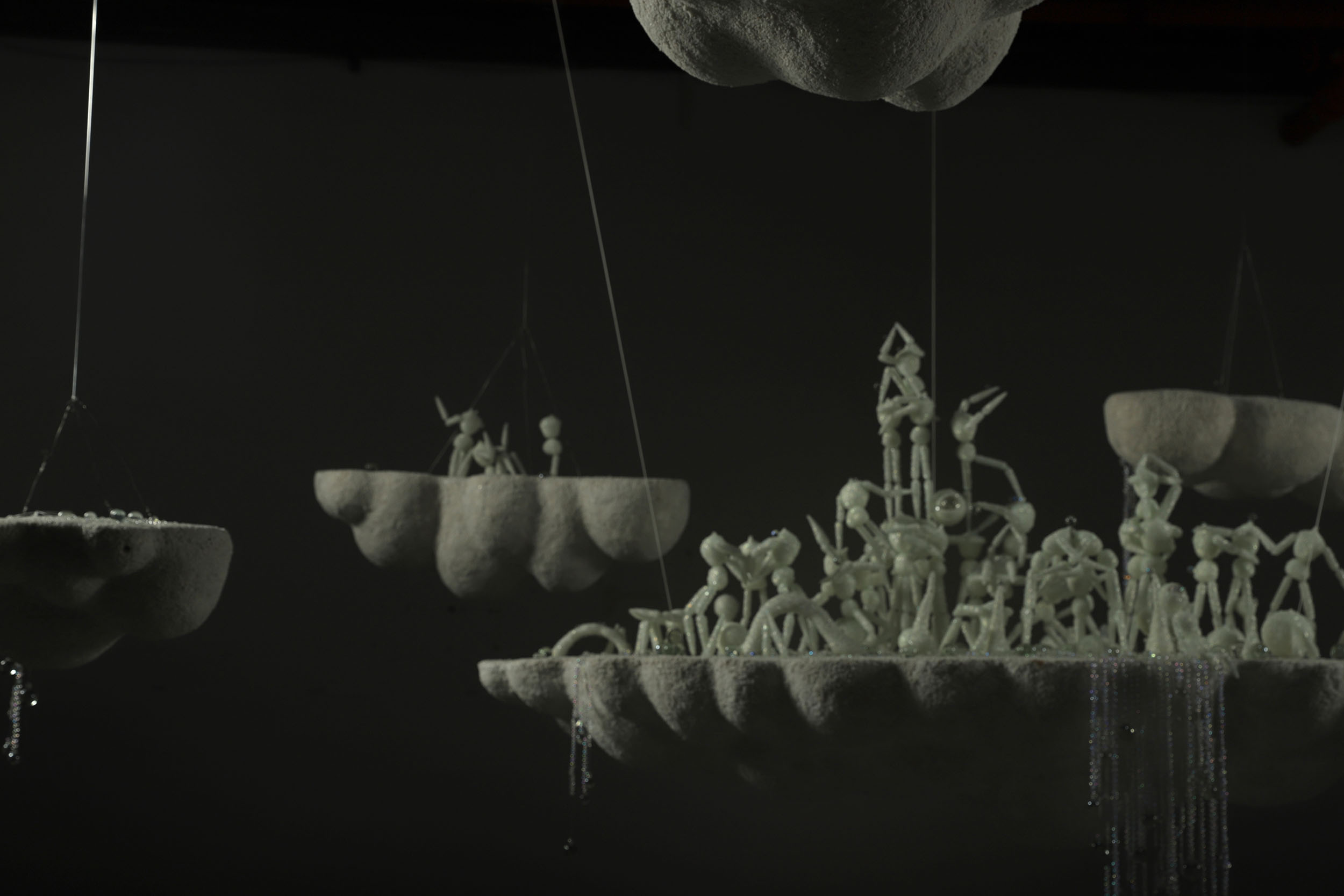 一座座大大小小的云朵小岛,大面积运用珠子这种材料。远远看起来十分华丽,梦幻,散发着耀眼的光芒,就像是一个梦境。而当你走近这场梦,它真的美好吗。一个个有着莫名其妙行为的人偶,它们看似忙碌,看似热闹,可连头都没有的它们到底在忙些什么。这到底是甜美的梦,还是挣扎的魇。灿烂的背后,往往是孤寂。