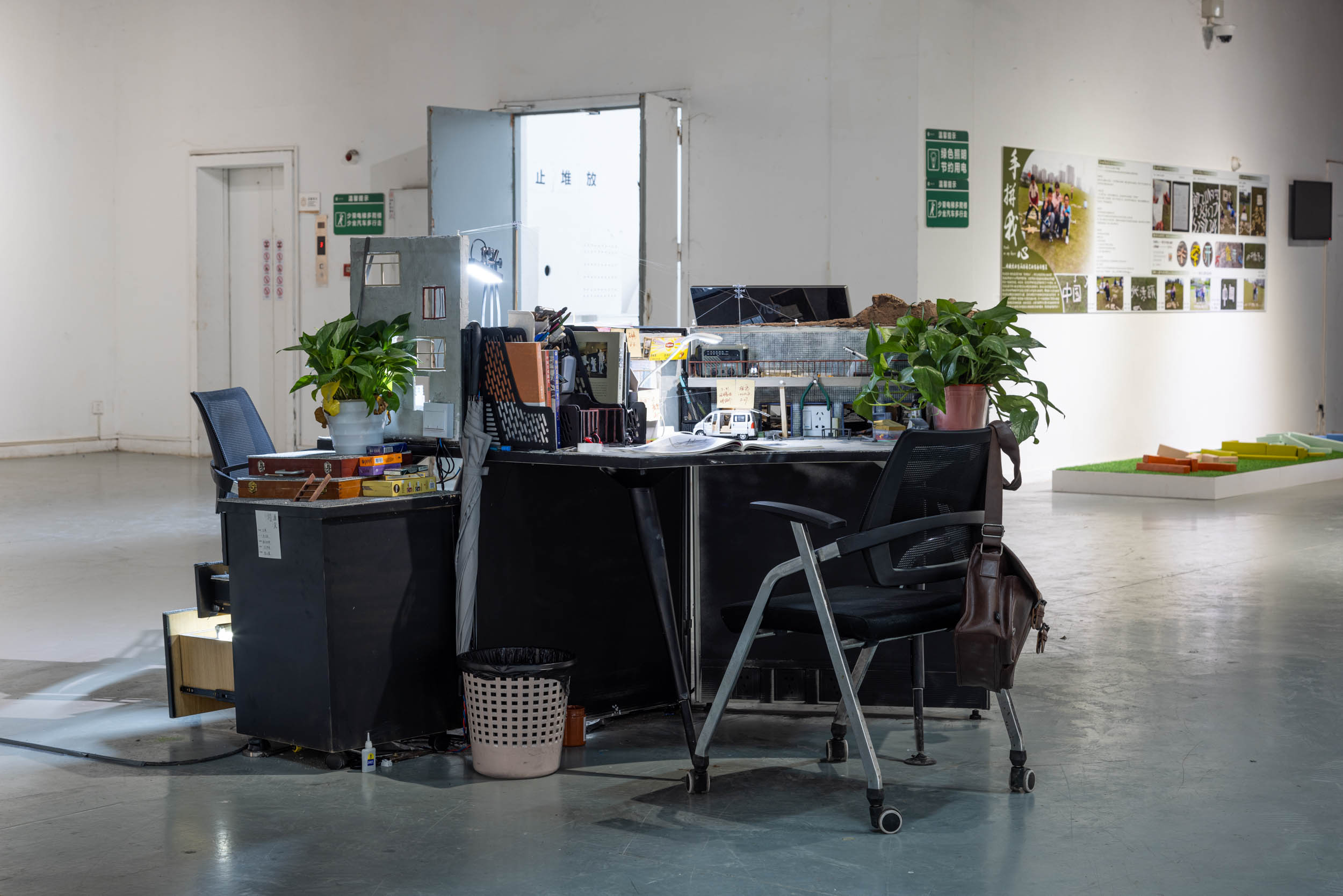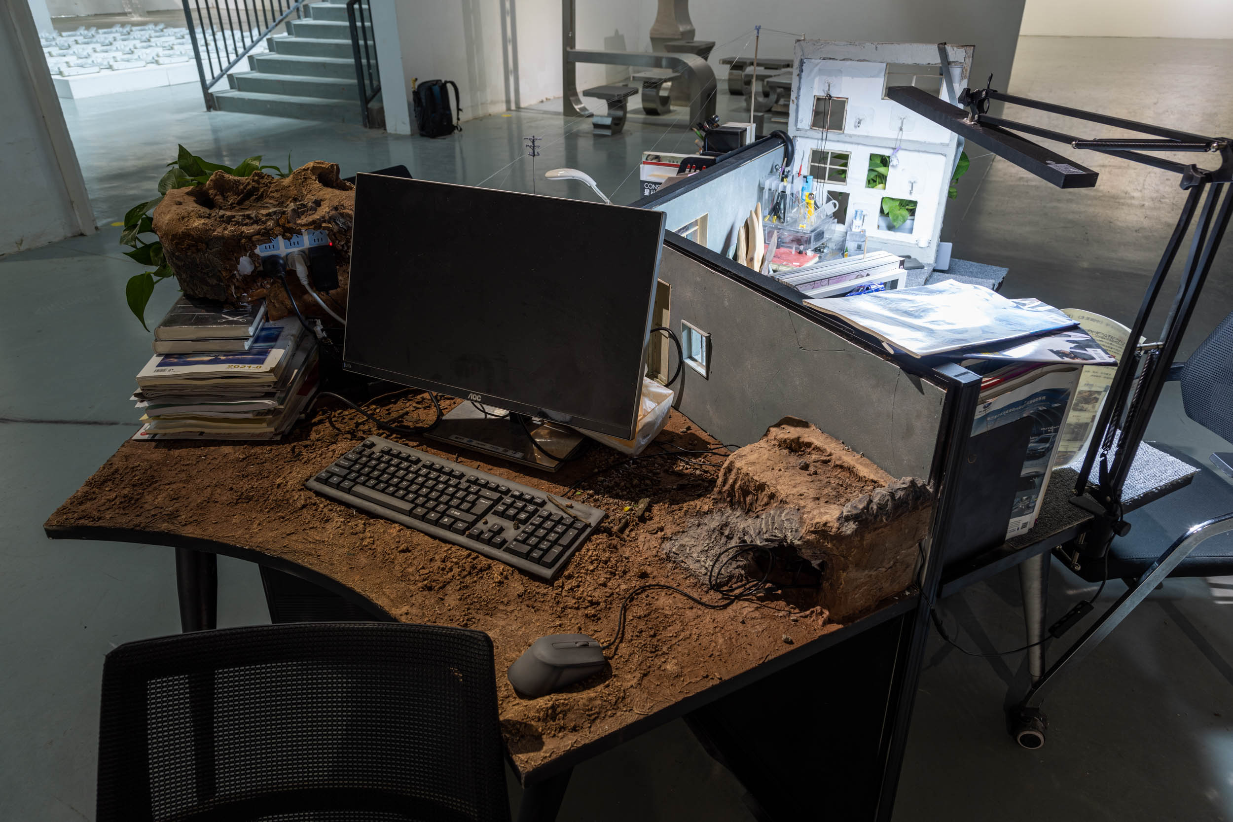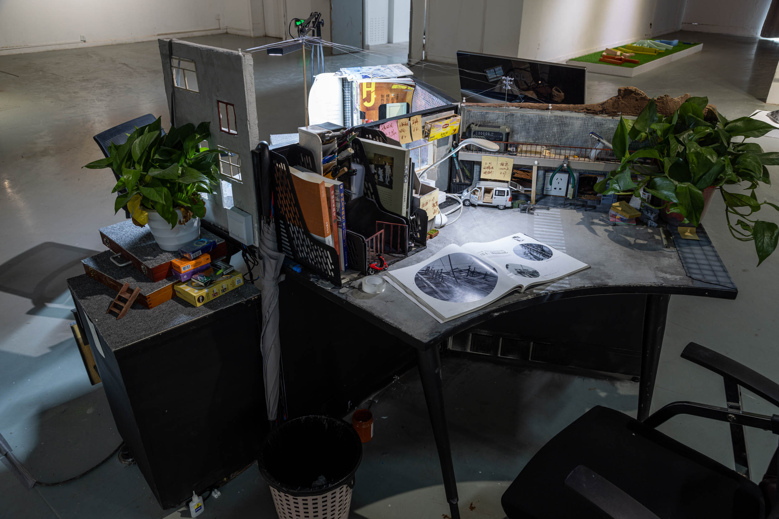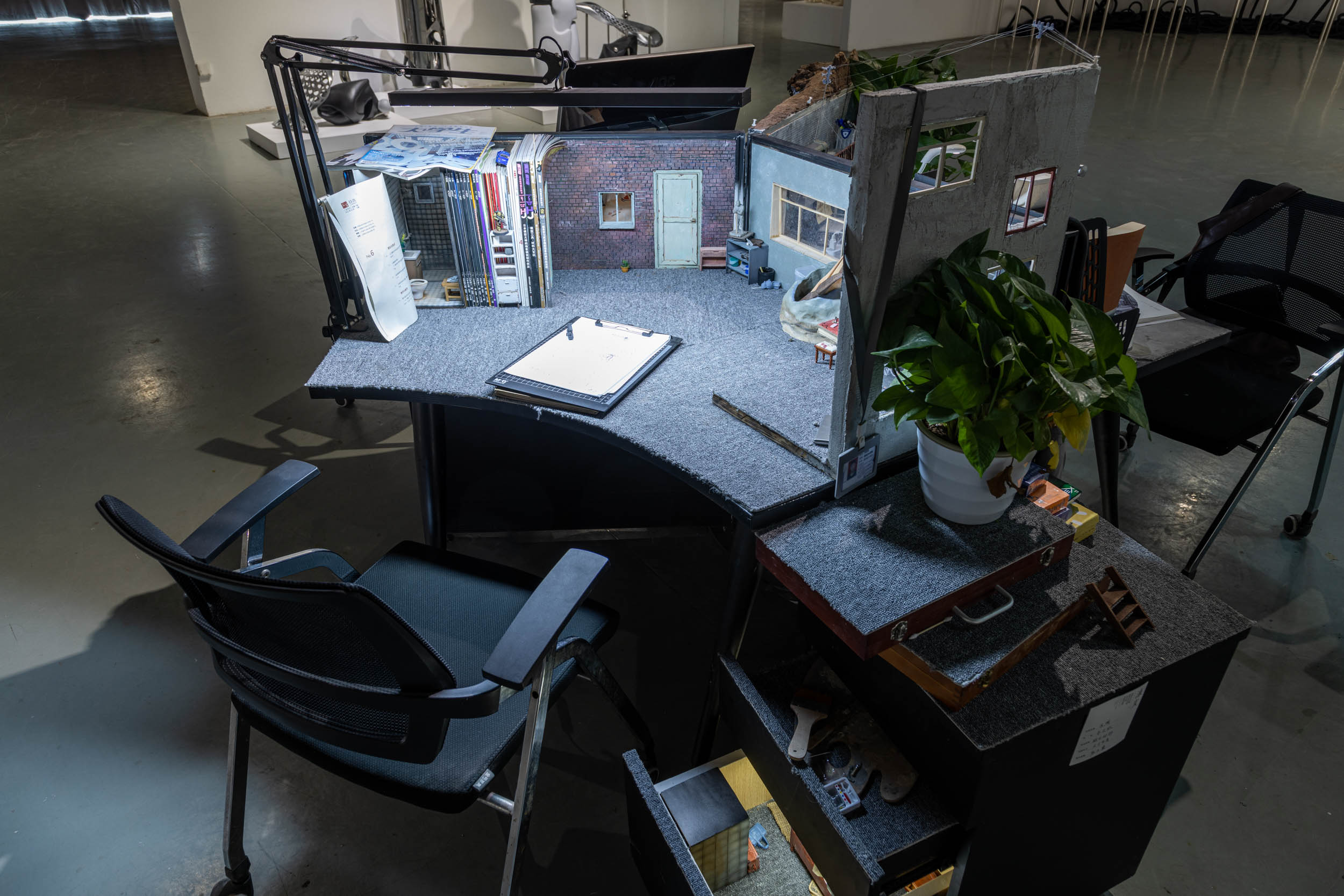 作品简介:作品区.域是一个办公场景,由一张布置着三组不同空间尺度的模型的圆形办公桌构成。作品的创作初衷是利用模型与现实场景中家具的结合以及不同比例尺寸模型的过渡来消除模型与现实空间中的隔阂,拉近模型与观众之间的距离。