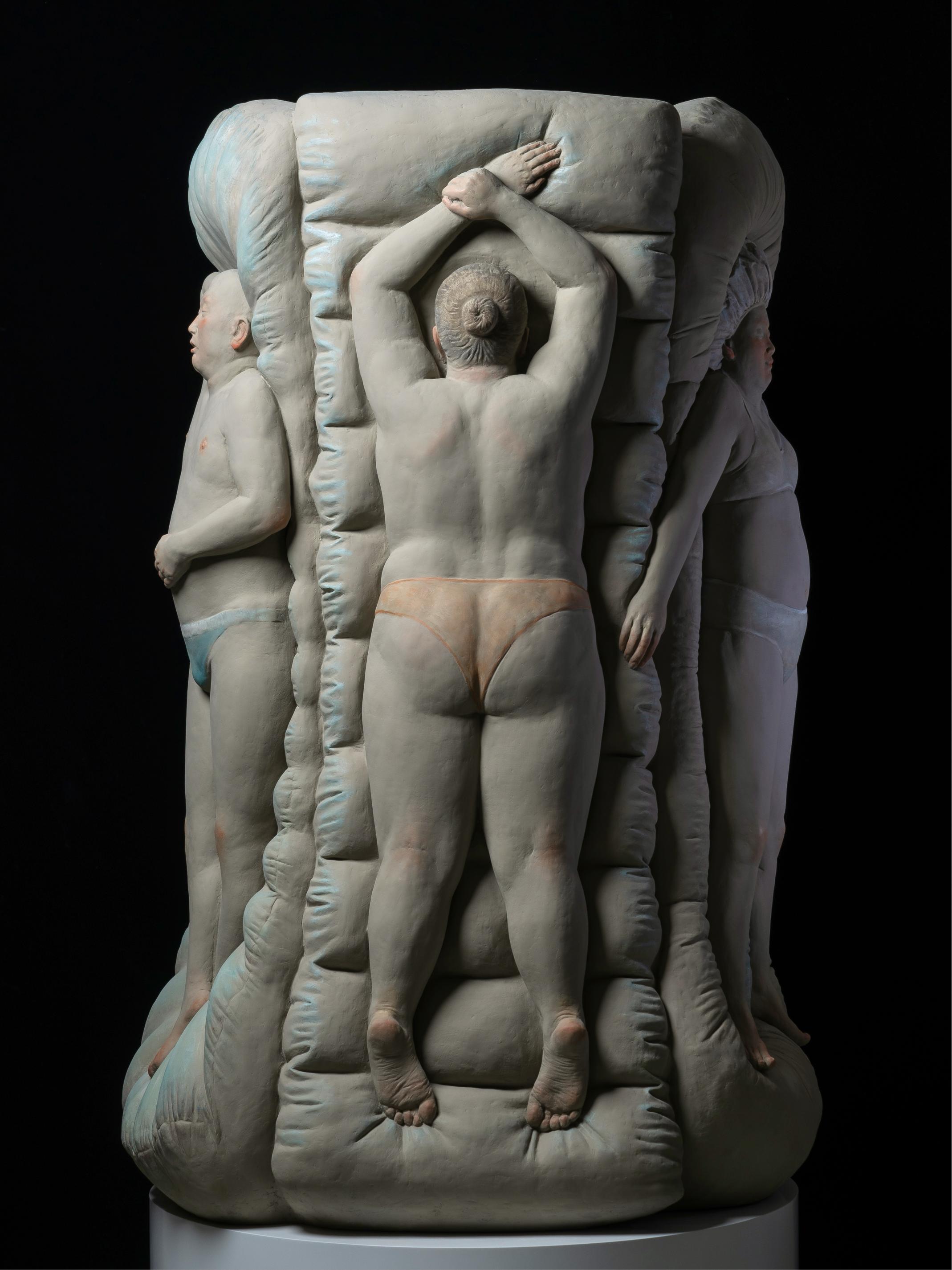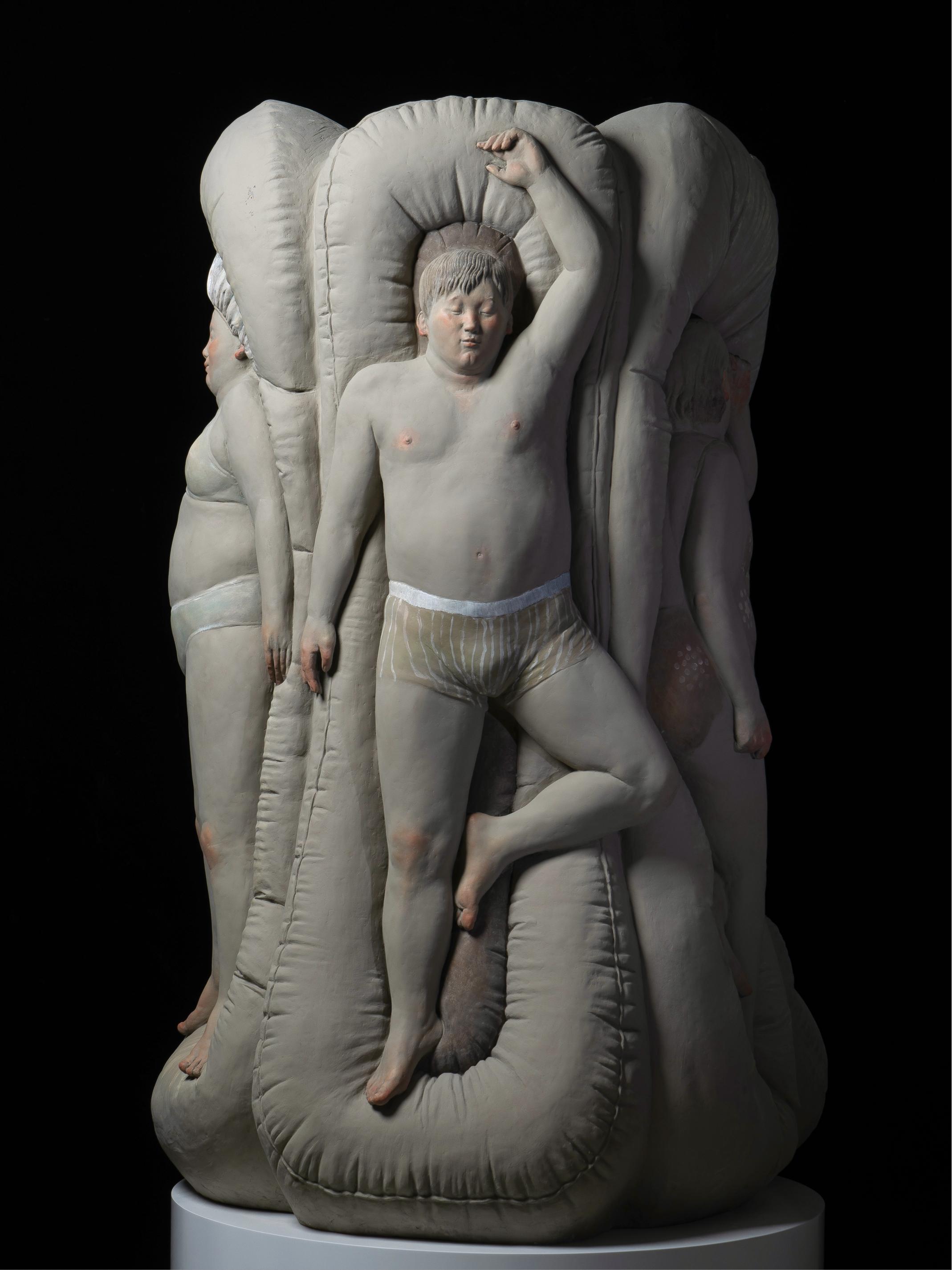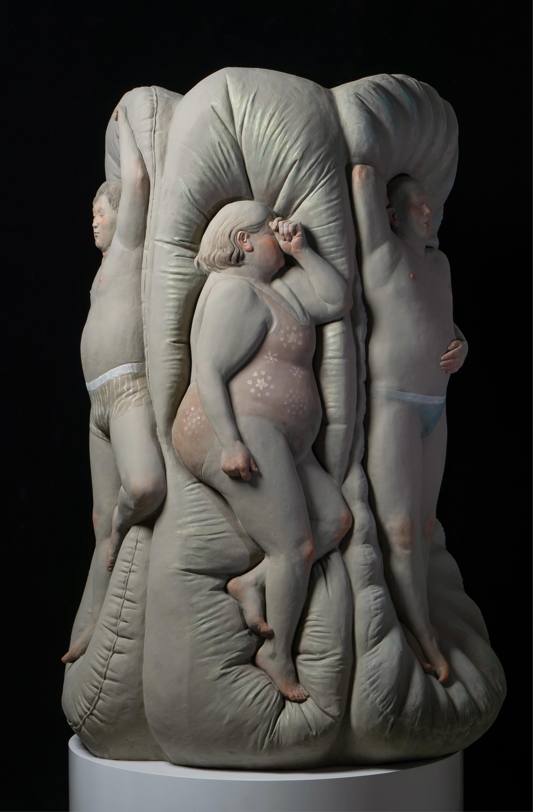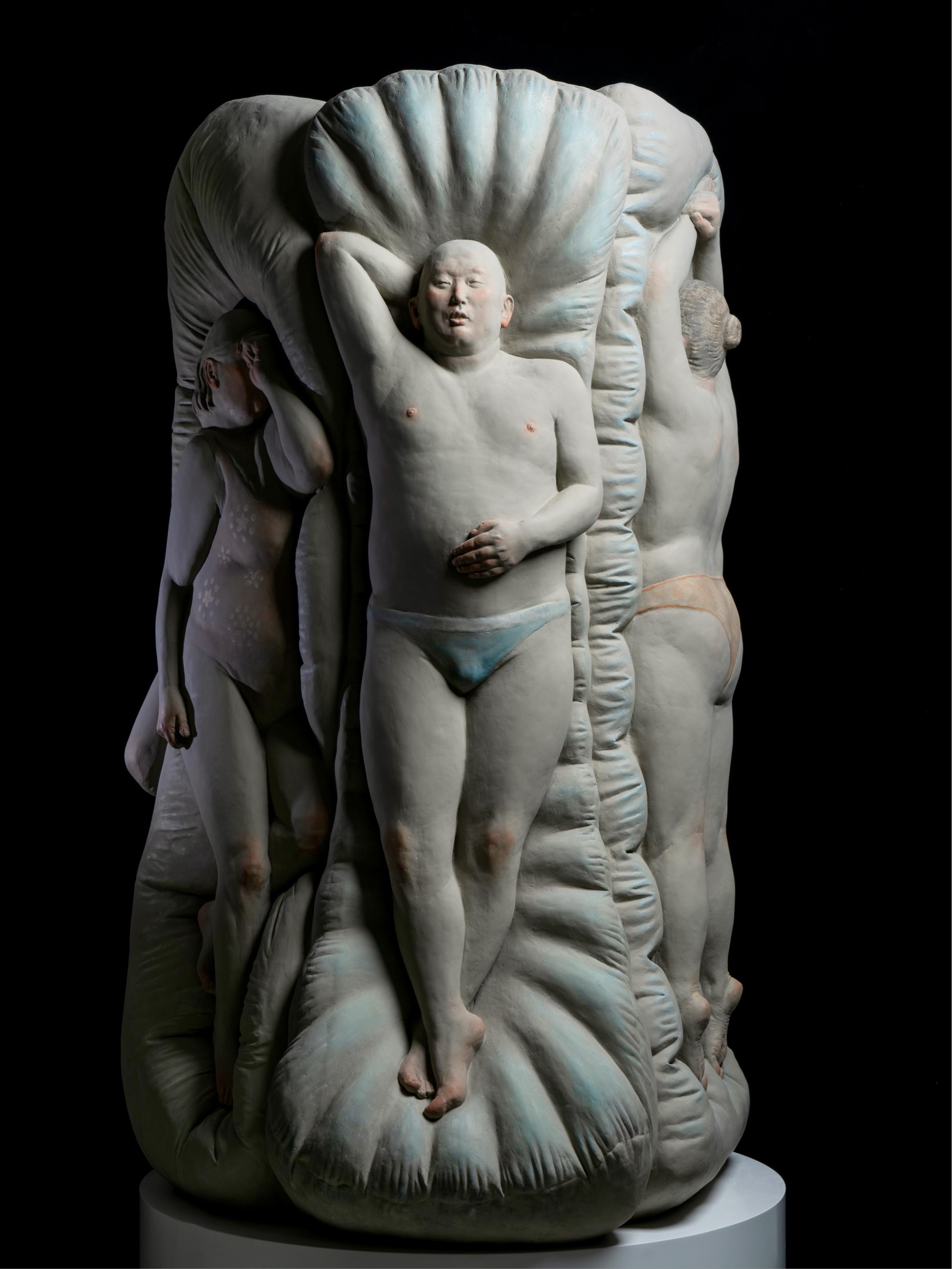 《日光之城》一方面意在展示人们在睡着时这一容易被人忽略又具有特别含义的动作与状态,一方面是描绘在阳关灿烂时舒适、自在的城市生活的其中一幕。通过塑造五个躺在垫子上晒太阳的城市大众形象,表达我对于当下美好生活的重新思考与感悟。作品将躺着的人物树立起来,建立了新的观看视角;将圆雕的形式手法与浮雕的具象写实的造型语言结合,使用立式连环画的构图对雕塑创作语言的尝试与探索。